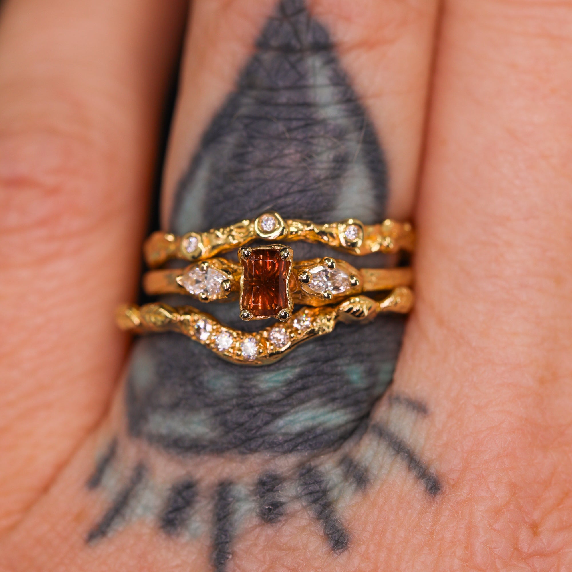 This one of a kind 14k yellow gold 3-stone ring features a very special petite Starbrite cut sappphire cut by the legendary John Dyer (Starbrite is a Trademarked faceted cut). The gemstone is a stunning orange sapphire (unheated). This gemstone and ring is completely one of a kind and ready to ship (resizable).