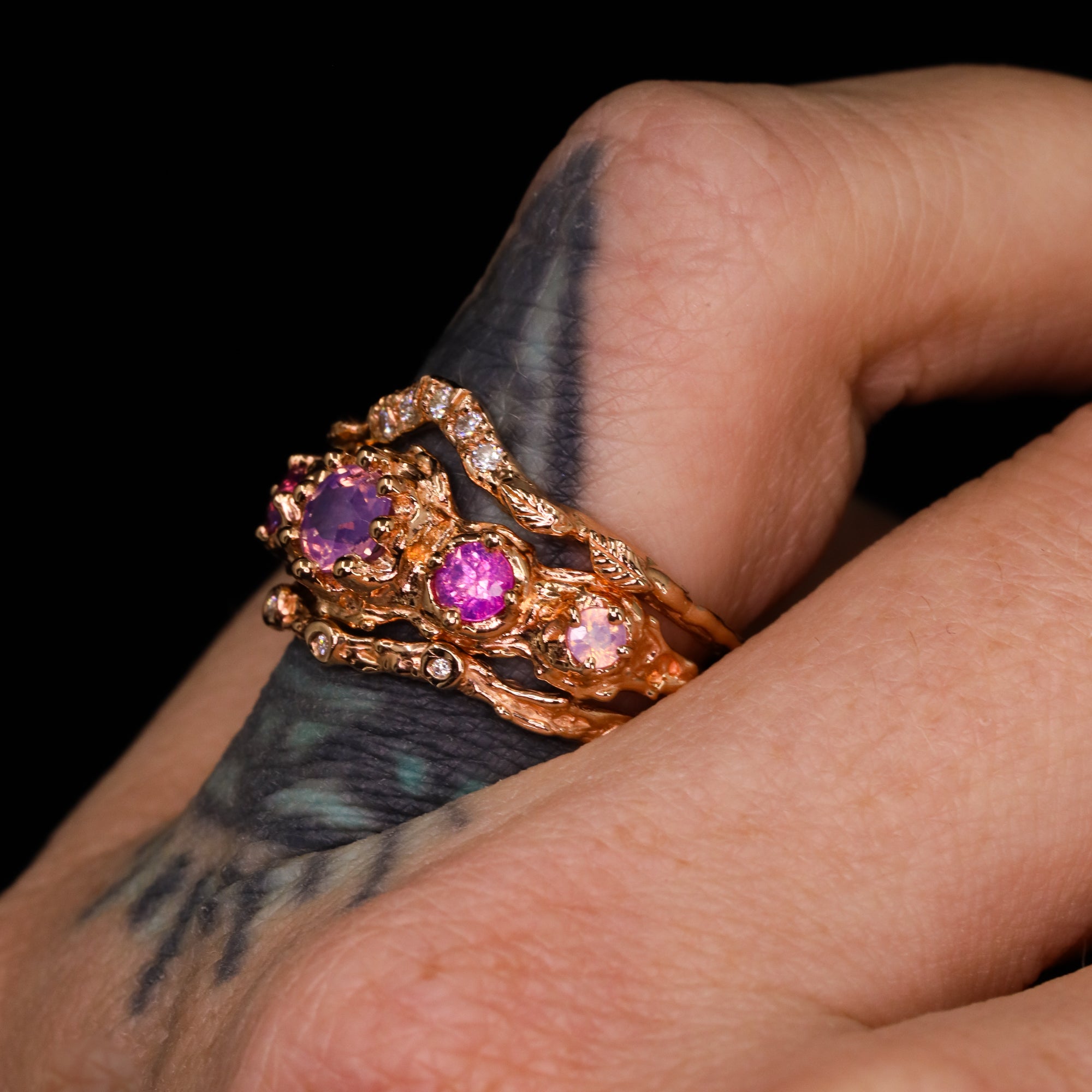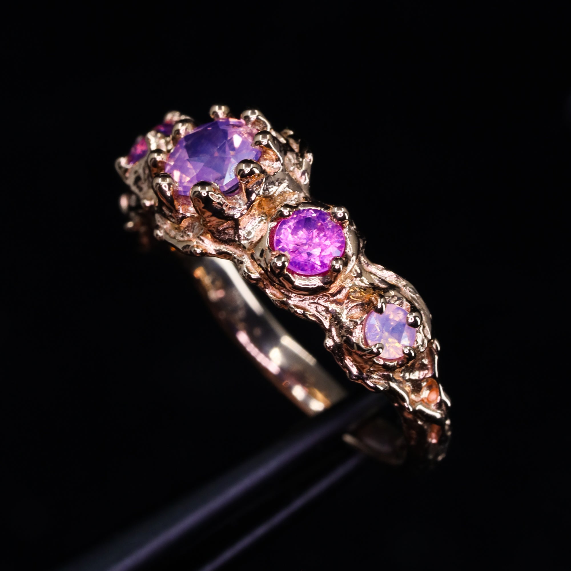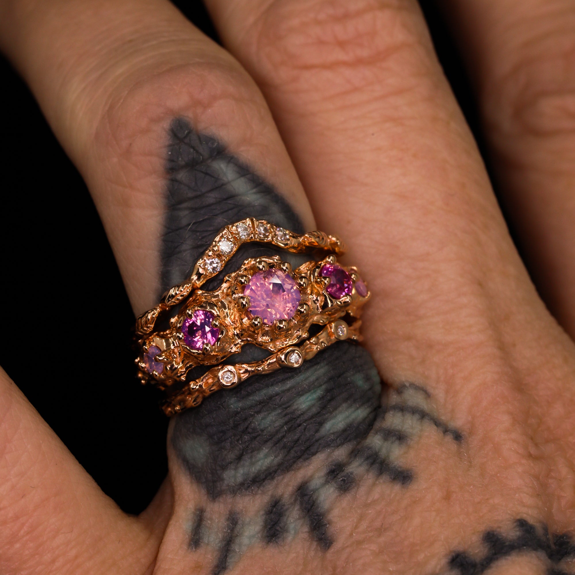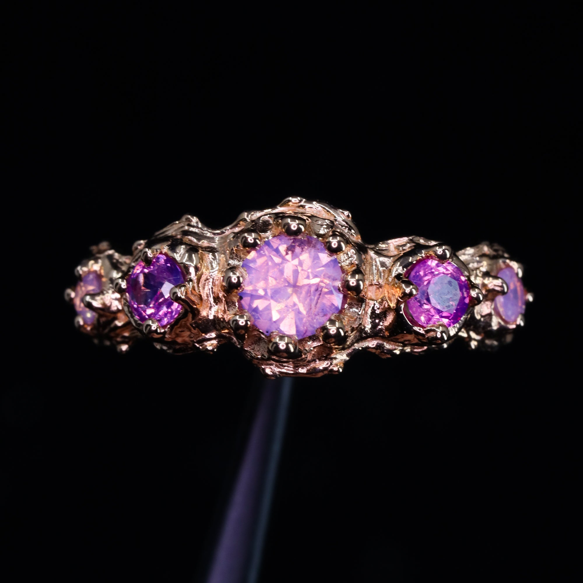 This hand-carved ring showcases five truly one-of-a-kind sapphires (the accent stones are sisters, not twins). Sculpted entirely by hand, this piece is one of a kind. The artist first shaped the design in wax before casting it in luminous 14k rose gold, then traditionally setting each natural sapphire by hand in Nashville, Tennessee.
