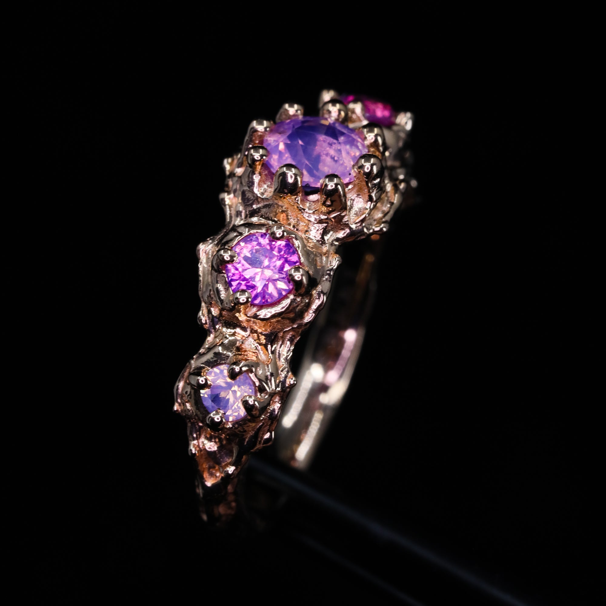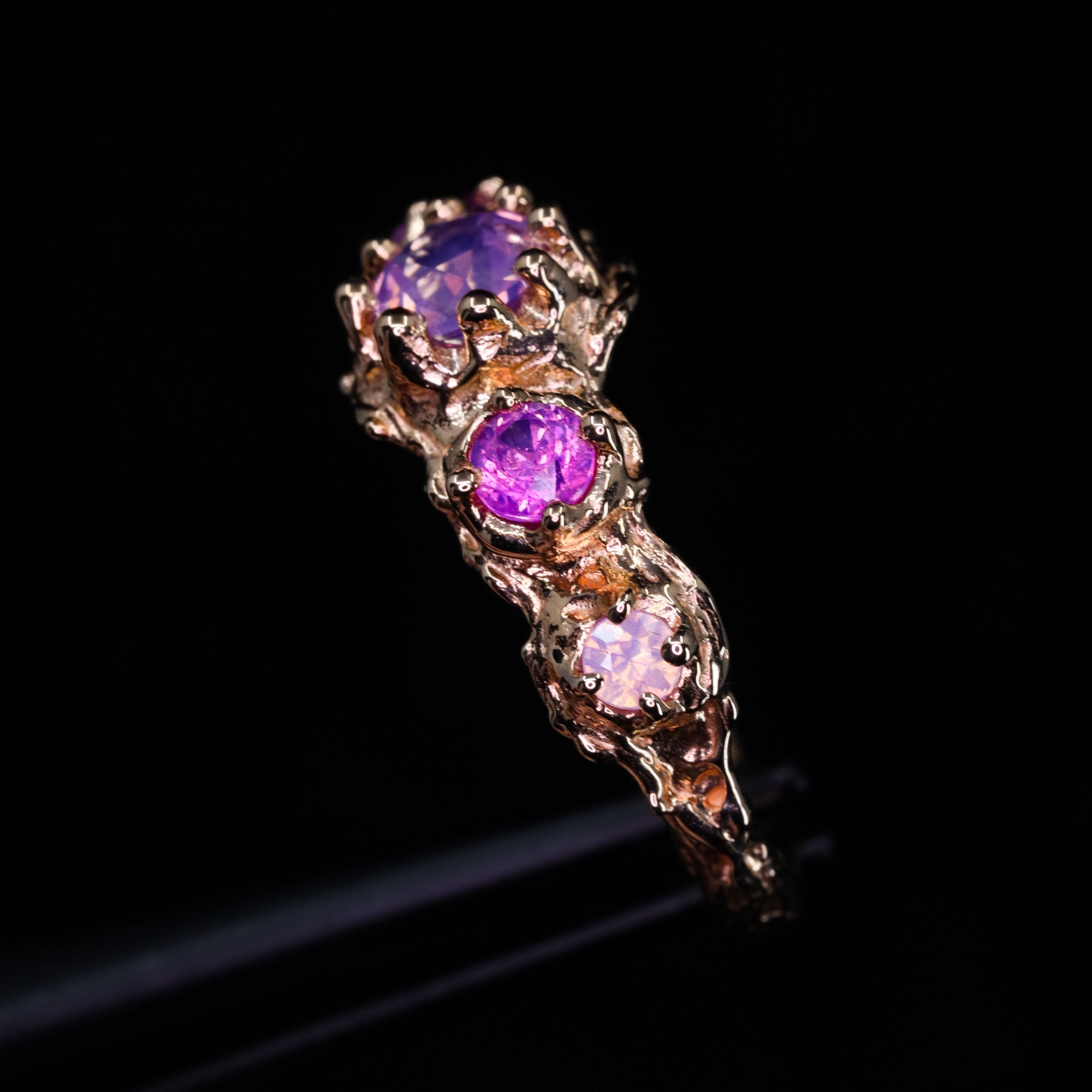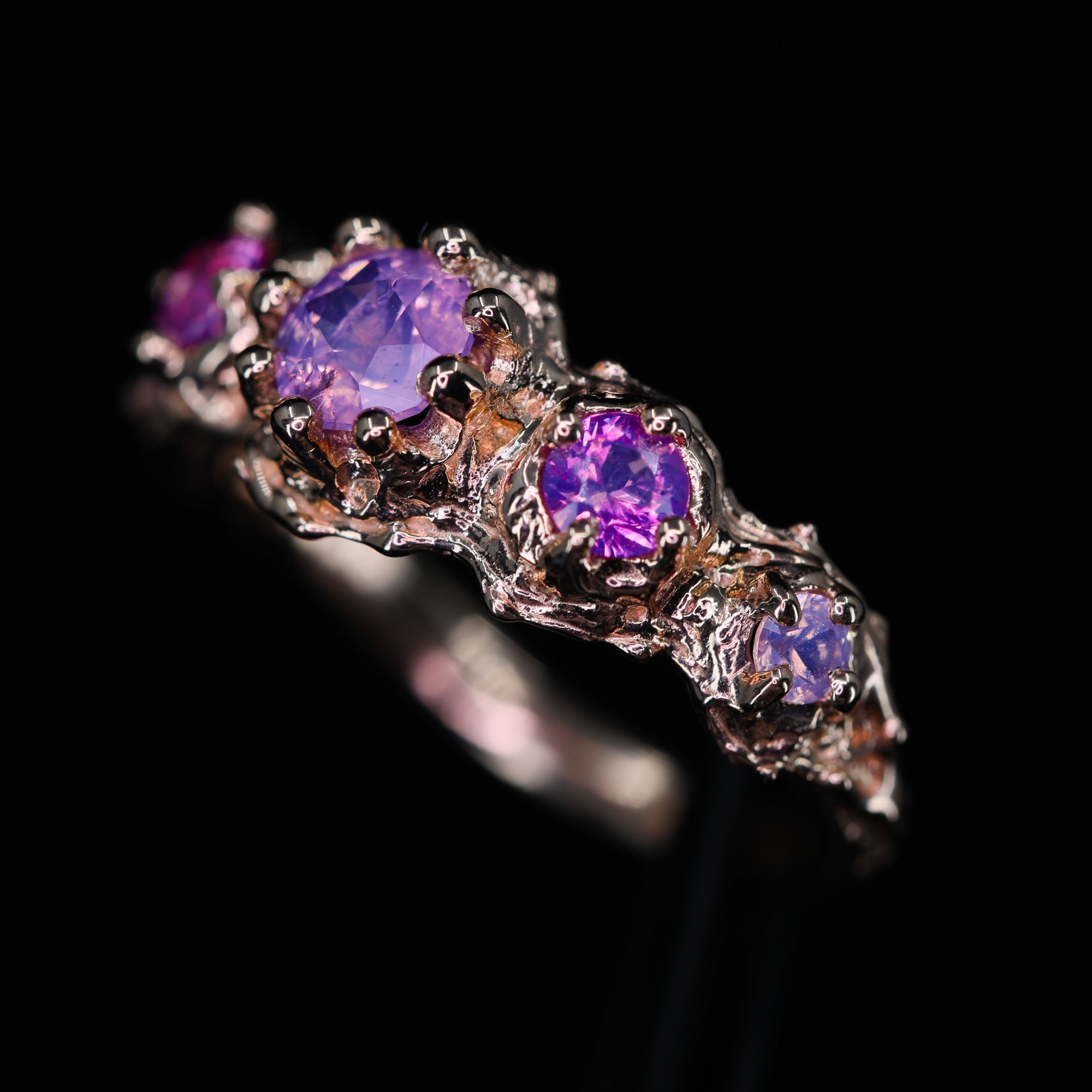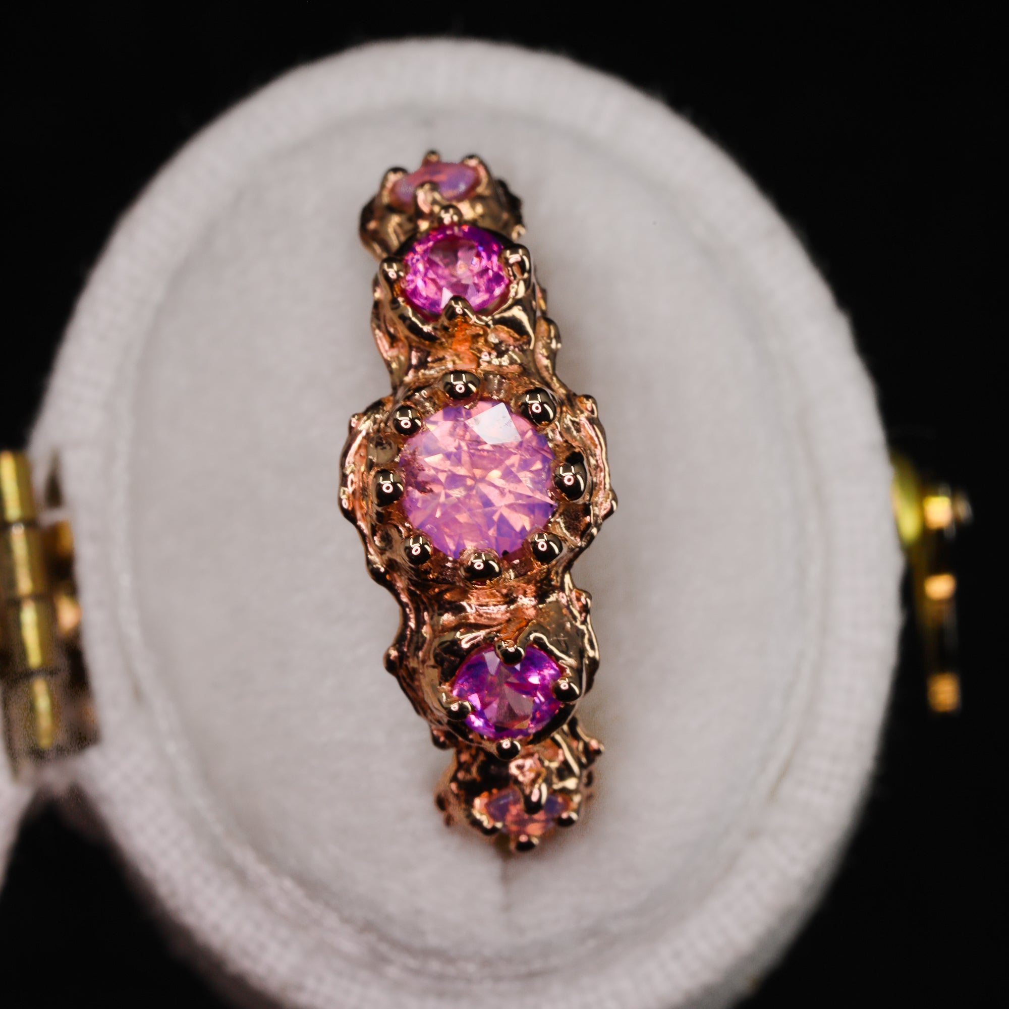 This hand-carved ring showcases five truly one-of-a-kind sapphires (the accent stones are sisters, not twins). Sculpted entirely by hand, this piece is one of a kind. The artist first shaped the design in wax before casting it in luminous 14k rose gold, then traditionally setting each natural sapphire by hand in Nashville, Tennessee.