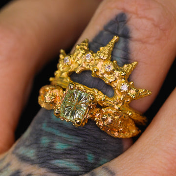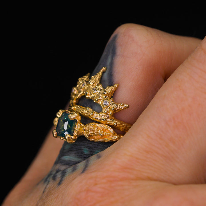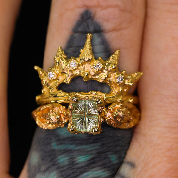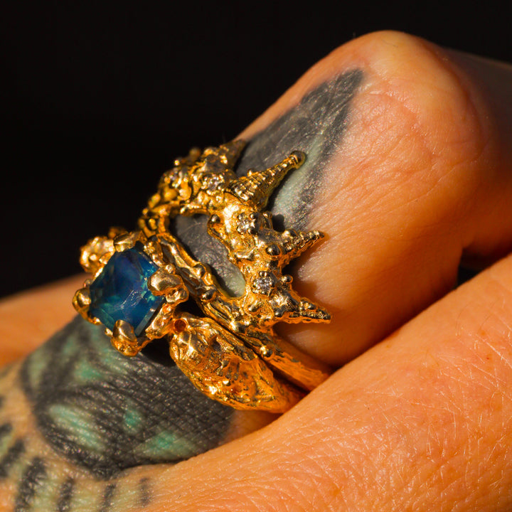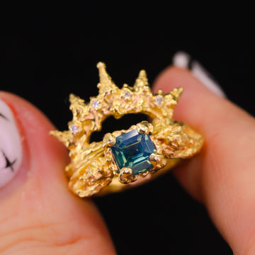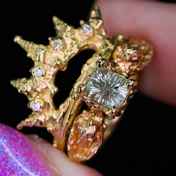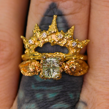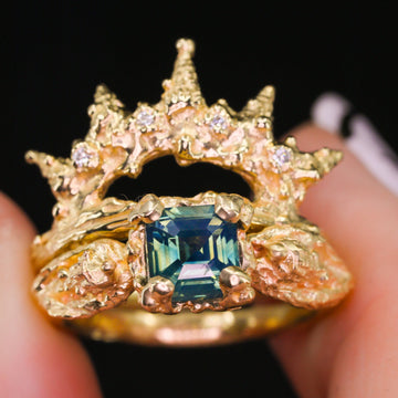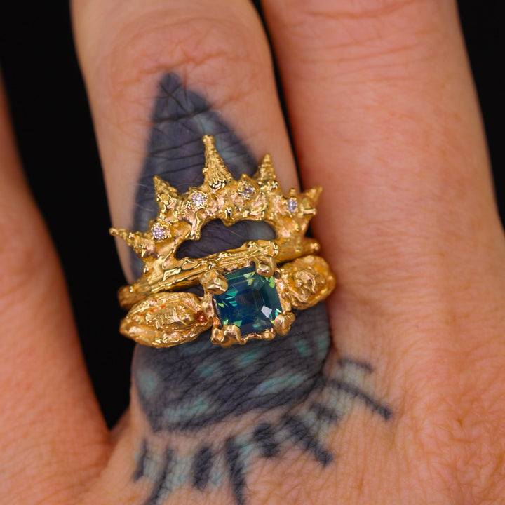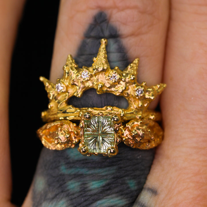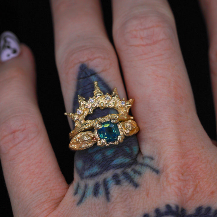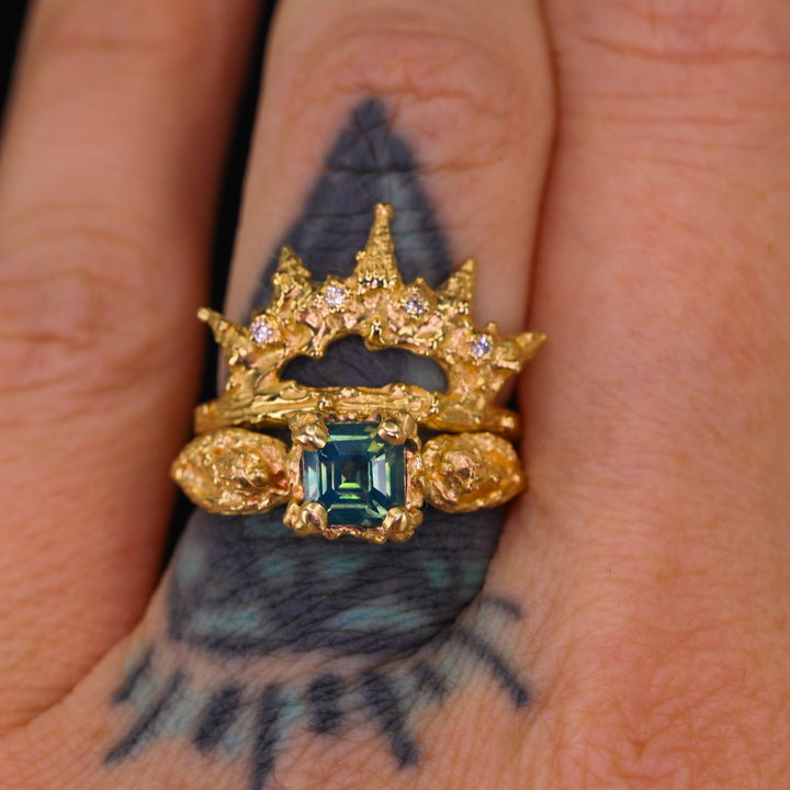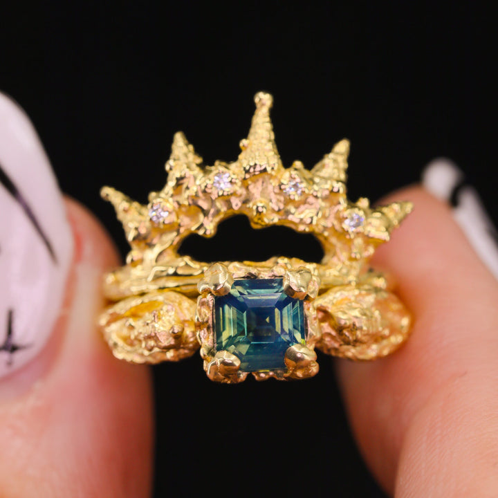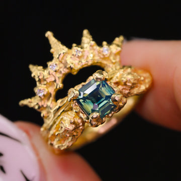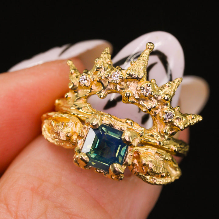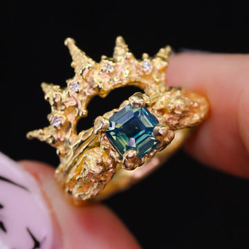 This design will feature a central sea bubble granulated prong-set gemstone of your choosing and seashell details on either side of the center setting. If ordering a ring set, it will arrive as a set of two rings with a matching Mermaid Crown diamond band (based on your selections in the drop-down menus). Each ring will be hand-carved to order so there will be variations for the engagement ring. Most stones will have prong rings, but for angular stones, we will recommend a prong covering each point of a stone to protect the points (i.e. hexagon, geometric, marquise). Each ring is hand-carved, so if you have any questions or prefer more customization, please send us an email here or email nicole [at] knotandsplice.com
