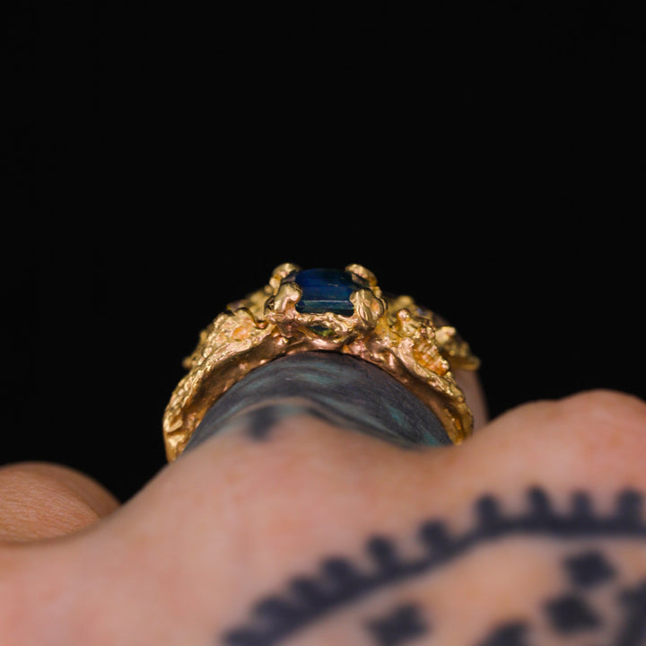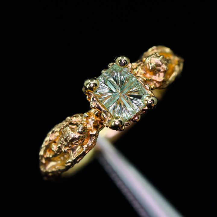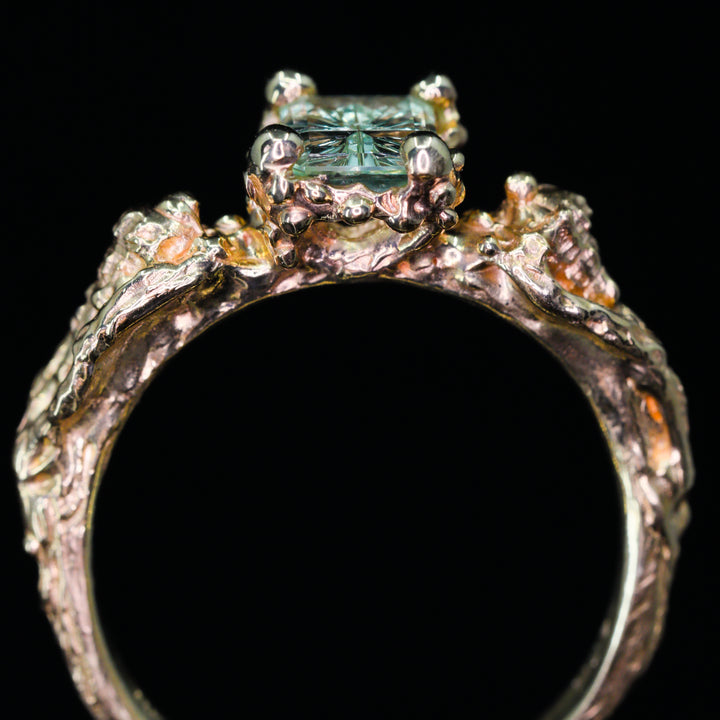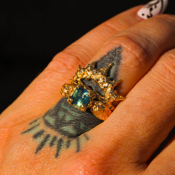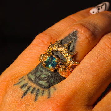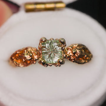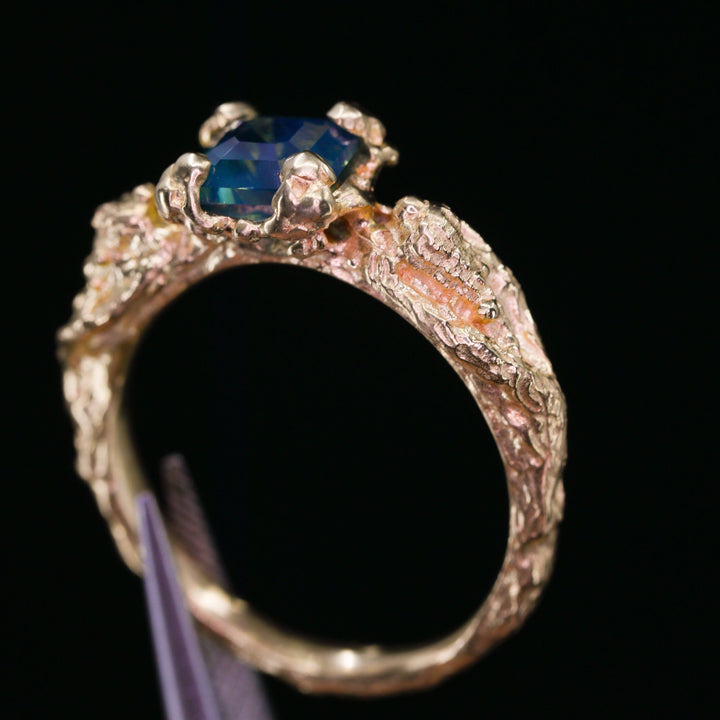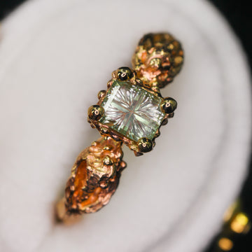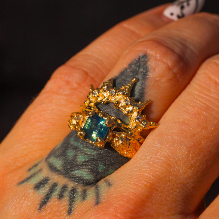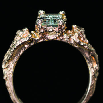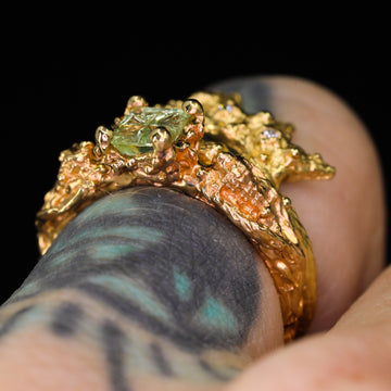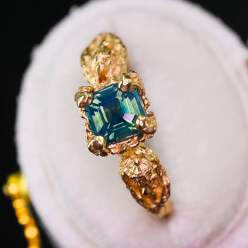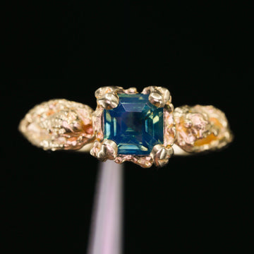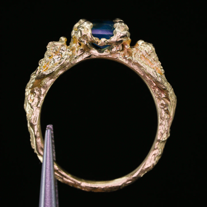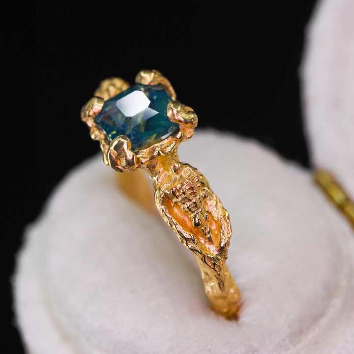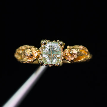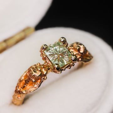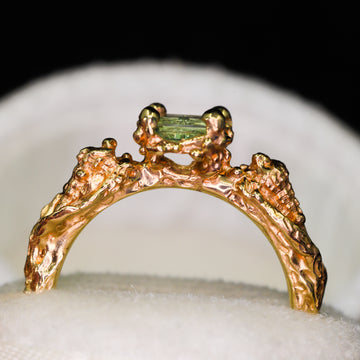 This design will feature a central sea bubble granulated prong-set gemstone of your choosing and seashell details on either side of the center setting. If ordering a ring set, it will arrive as a set of two rings with a matching Mermaid Crown diamond band (based on your selections in the drop-down menus). Each ring will be hand-carved to order so there will be variations for the engagement ring. Most stones will have prong rings, but for angular stones, we will recommend a prong covering each point of a stone to protect the points (i.e. hexagon, geometric, marquise). Each ring is hand-carved, so if you have any questions or prefer more customization, please send us an email here or email nicole [at] knotandsplice.com