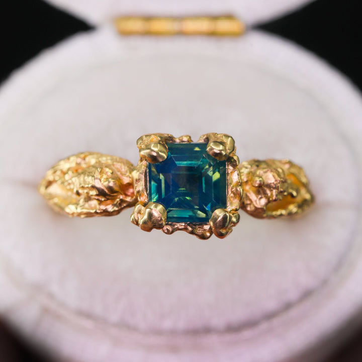 • Pictured center setting sizes (your ring will be based on the size of the selected center gemstone): John Dyer pastel green Starbrite sapphire 0.67 ct Montana sapphire in a rectangle shape (5.60 x 4.60 mm); 1.30ct opalescent teal sapphire (approx. 7.73 mm x 8.2 mm x 5.3 mm (depth)