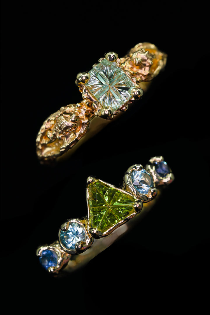 The finished rings in the photos are available as ready to ship/one of a kind rings available: here and here. For a create your own version, your ring will be custom-made in the same style. Please select a gemstone from our Loose gems section for your ring.