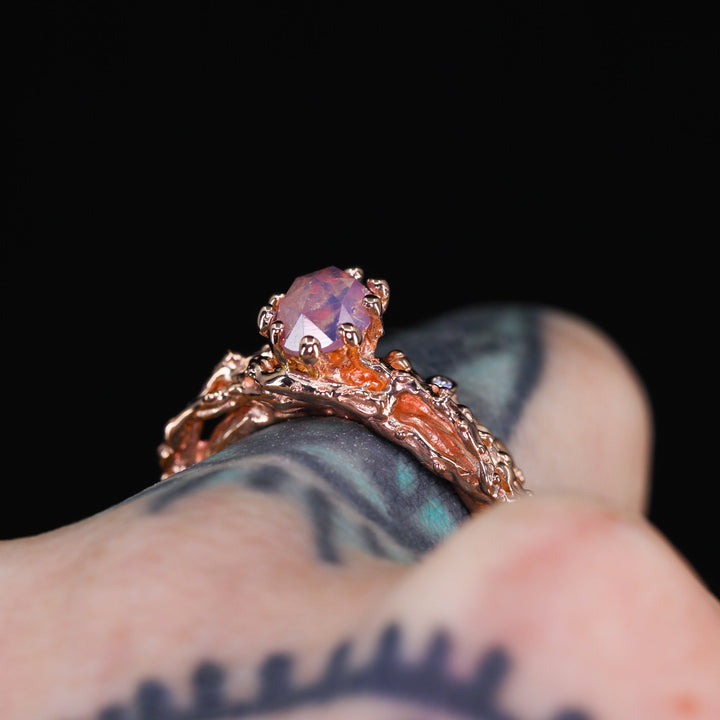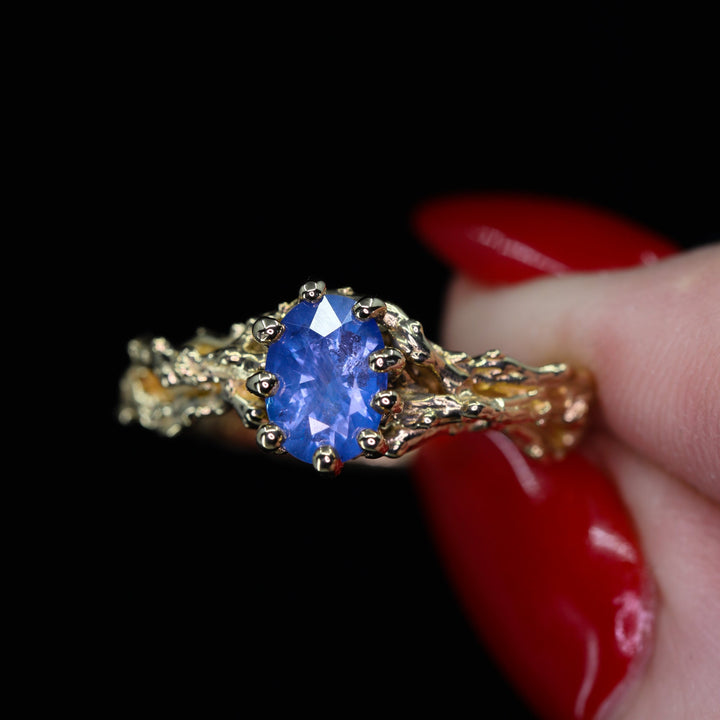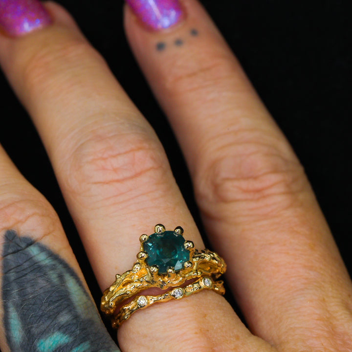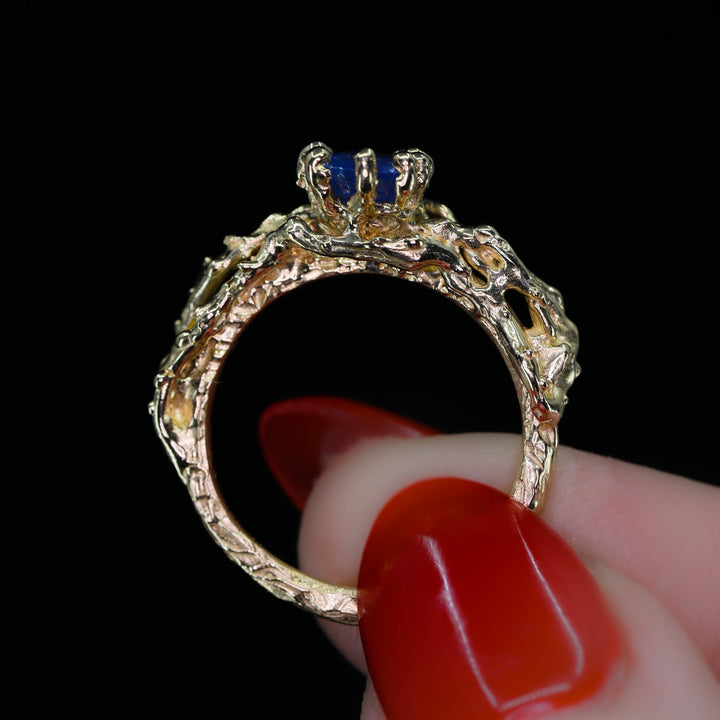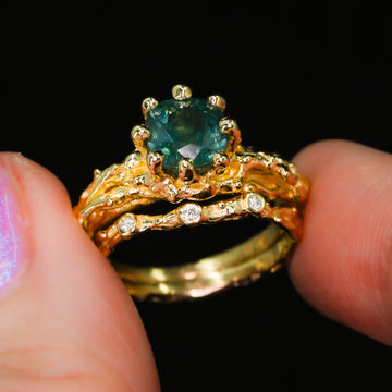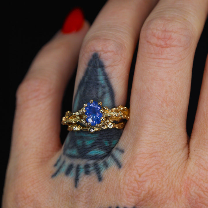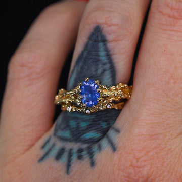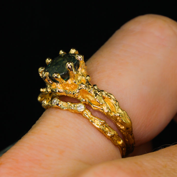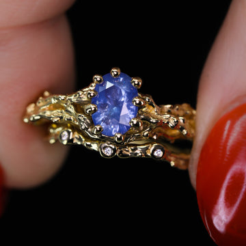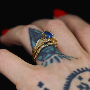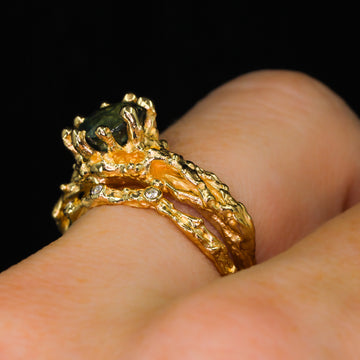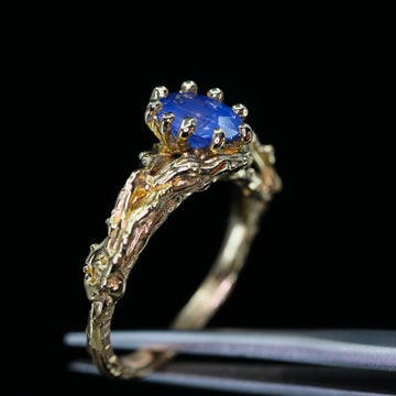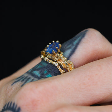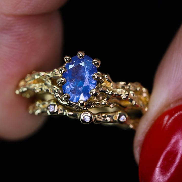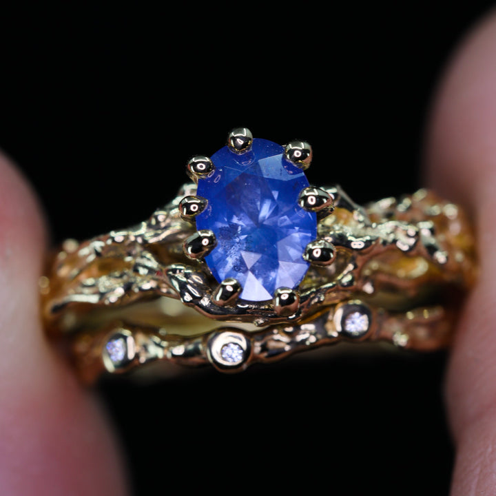 Each ring is one of a kind and will be lovingly hand-sculpted in wax, cast for all times in 14k gold. It is very sculptural with intertwining vine-like tendrils that encompass a gemstone. Pictured are two Reverie rings we have made (one with a rosecut (pink) and one with a fully faceted oval cut (blue/periwinkle). The matching band (our Briony ring) was created to fit perfectly and sits underneath the sapphire ring setting (nested) with three tiny glistening inset diamonds. "Reverie" is a state of being lost in one's own dreams (daydreaming)...this is such for the heart's desire, that all the soul would light afire.