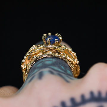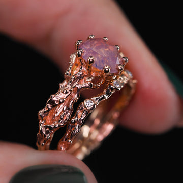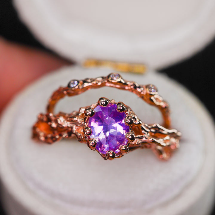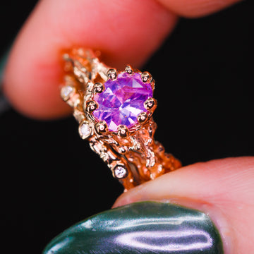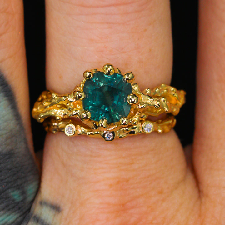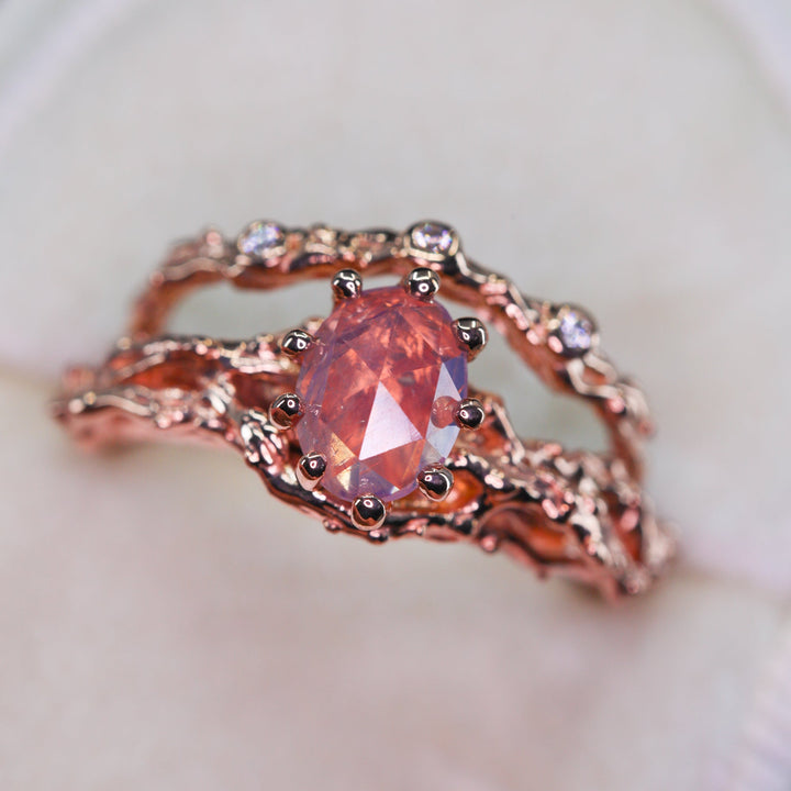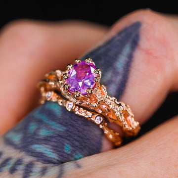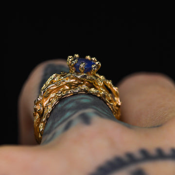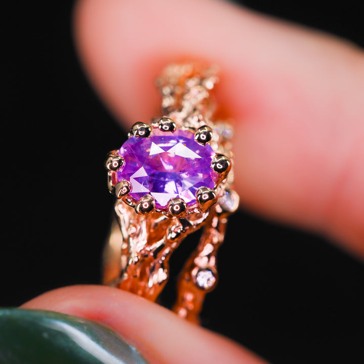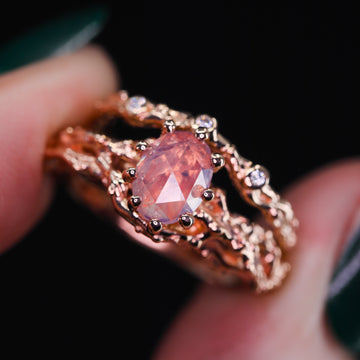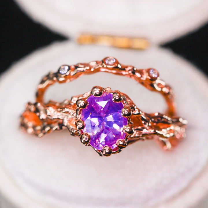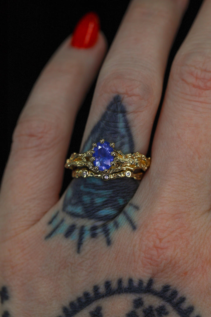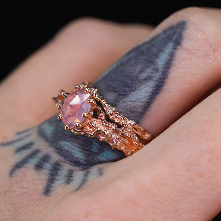 Each ring is one of a kind and will be lovingly hand-sculpted in wax, cast for all times in 14k gold. It is very sculptural with intertwining vine-like tendrils that encompass a gemstone. Pictured are two Reverie rings we have made (one with a rosecut (pink) and one with a fully faceted oval cut (blue/periwinkle). The matching band (our Briony ring) was created to fit perfectly and sits underneath the sapphire ring setting (nested) with three tiny glistening inset diamonds. "Reverie" is a state of being lost in one's own dreams (daydreaming)...this is such for the heart's desire, that all the soul would light afire.