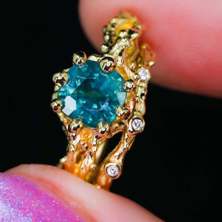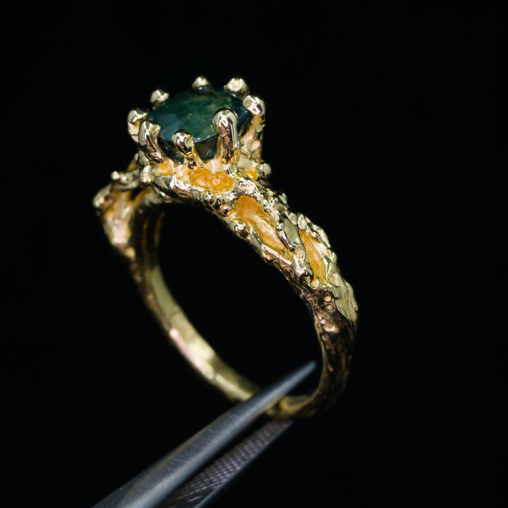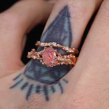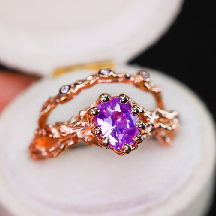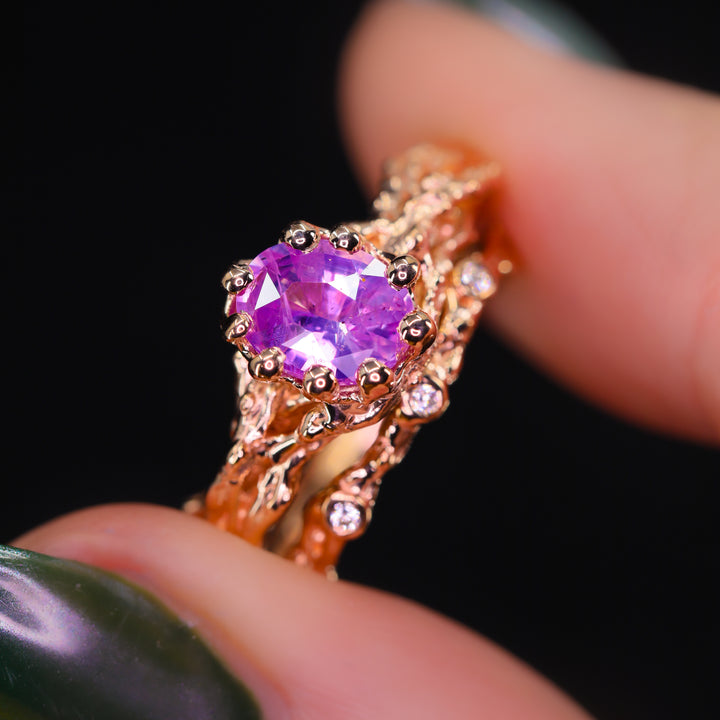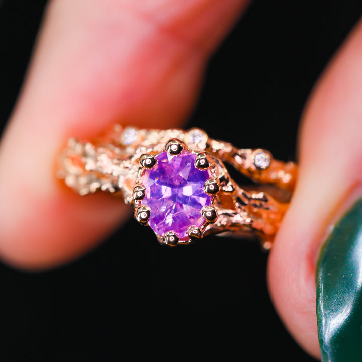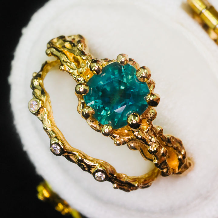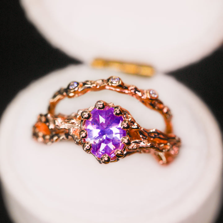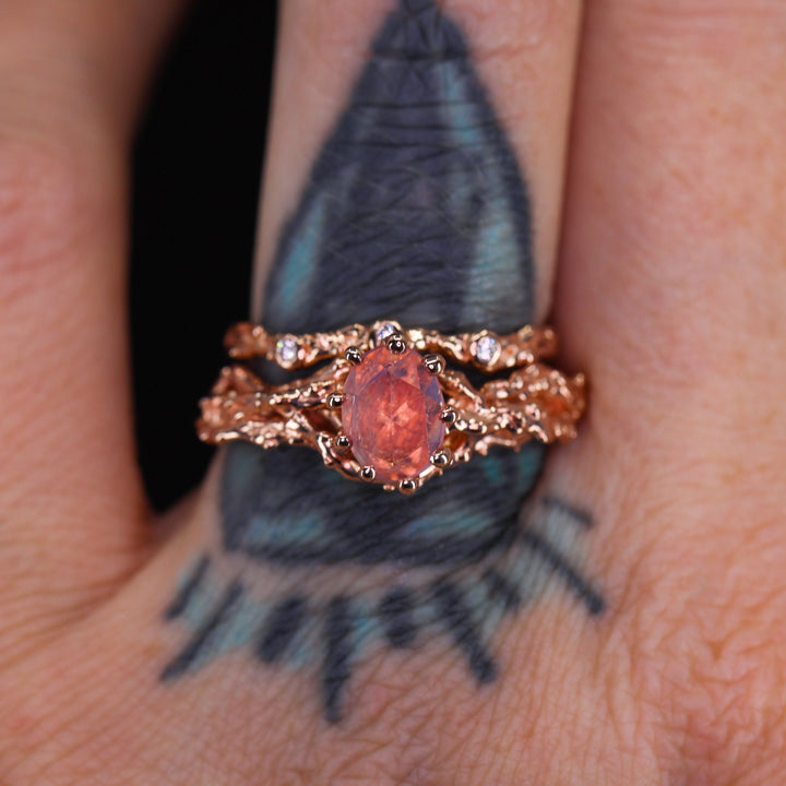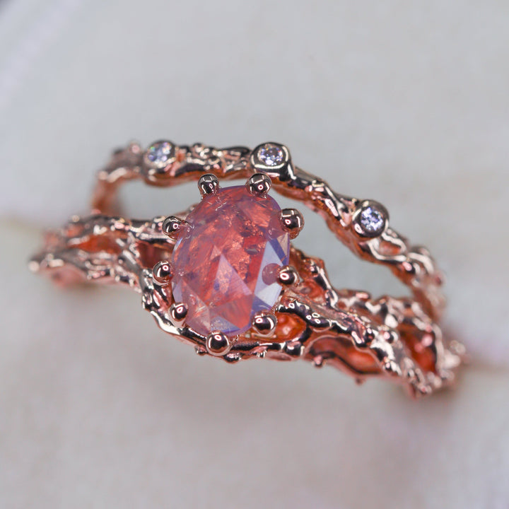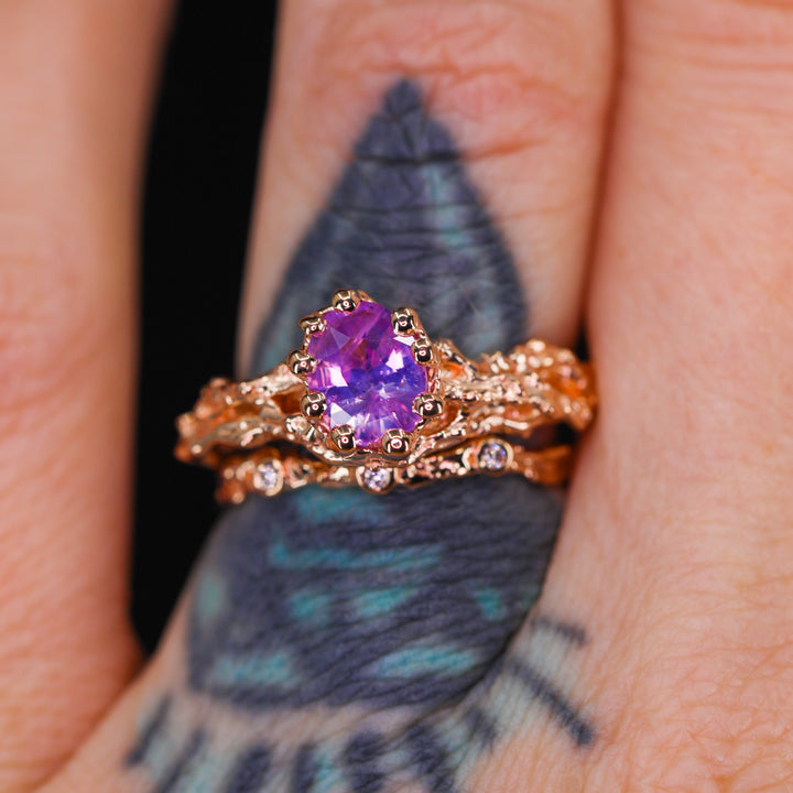 Each ring is one of a kind and will be lovingly hand-sculpted in wax, cast for all times in 14k gold. It is very sculptural with intertwining vine-like tendrils that encompass a gemstone. Pictured are two Reverie rings we have made (one with a rosecut (pink) and one with a fully faceted oval cut (blue/periwinkle). The matching band (our Briony ring) was created to fit perfectly and sits underneath the sapphire ring setting (nested) with three tiny glistening inset diamonds. "Reverie" is a state of being lost in one's own dreams (daydreaming)...this is such for the heart's desire, that all the soul would light afire.