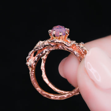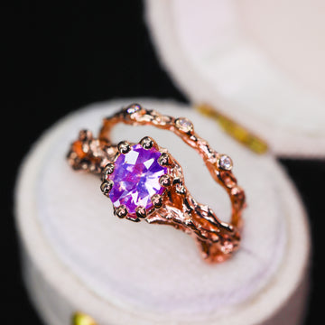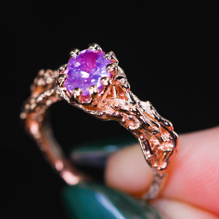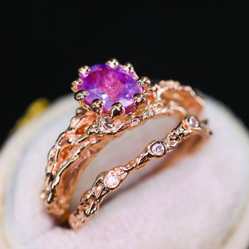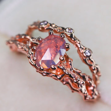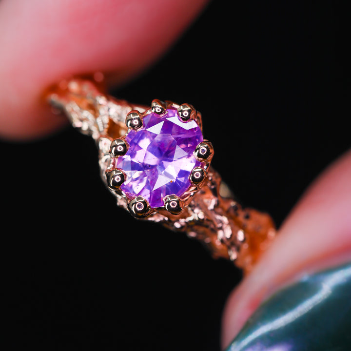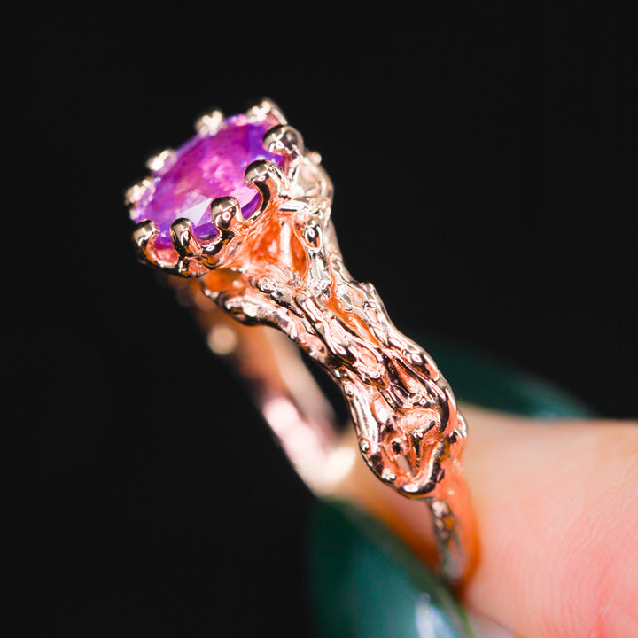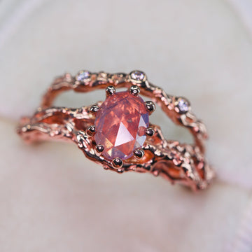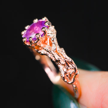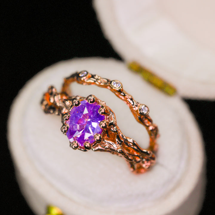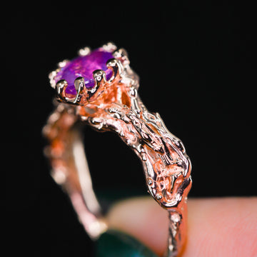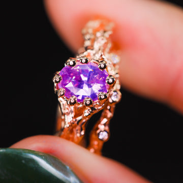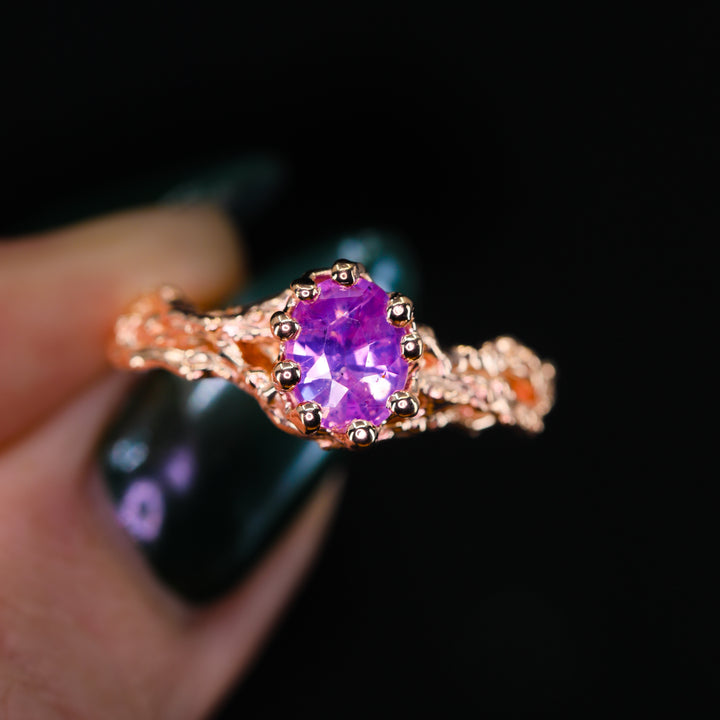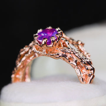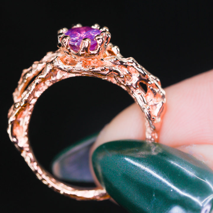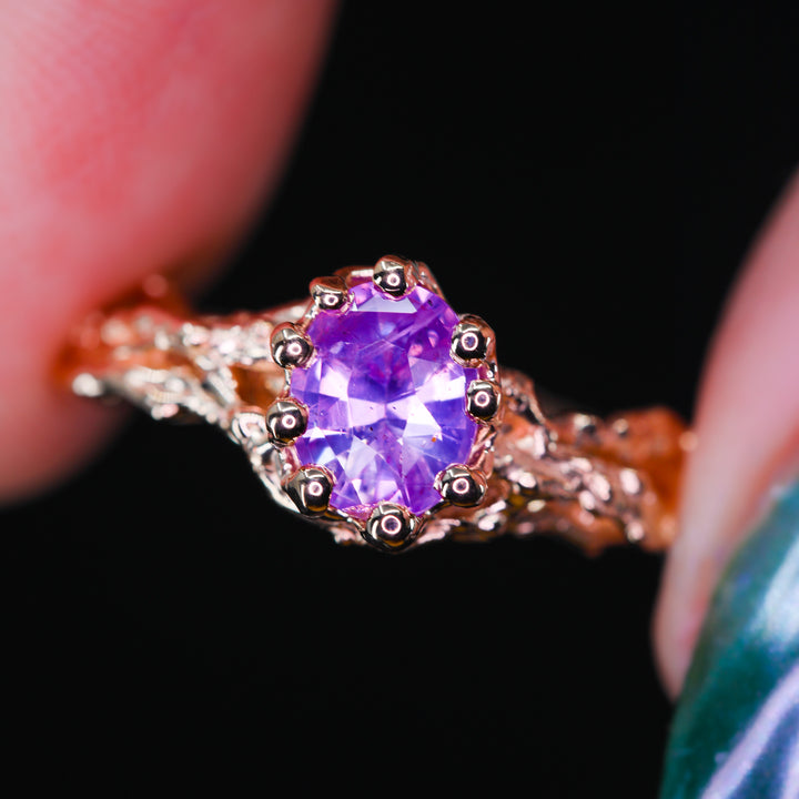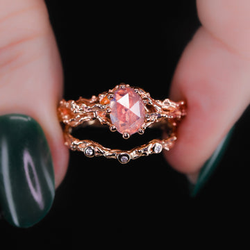 Each ring is one of a kind and will be lovingly hand-sculpted in wax, cast for all times in 14k gold. It is very sculptural with intertwining vine-like tendrils that encompass a gemstone. Pictured are two Reverie rings we have made (one with a rosecut (pink) and one with a fully faceted oval cut (blue/periwinkle). The matching band (our Briony ring) was created to fit perfectly and sits underneath the sapphire ring setting (nested) with three tiny glistening inset diamonds. "Reverie" is a state of being lost in one's own dreams (daydreaming)...this is such for the heart's desire, that all the soul would light afire.