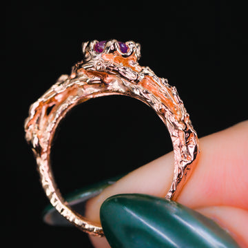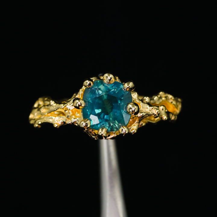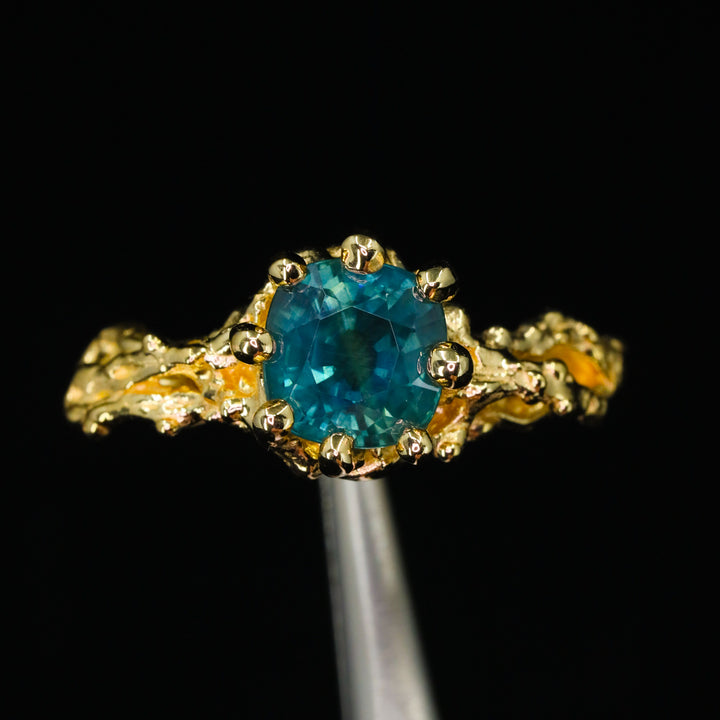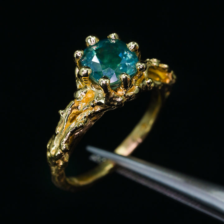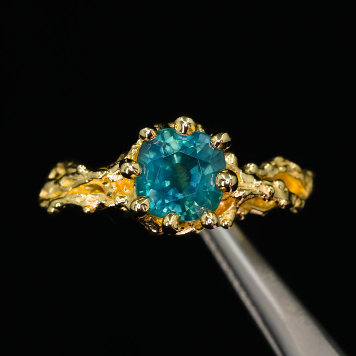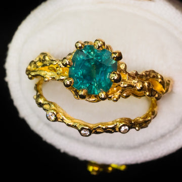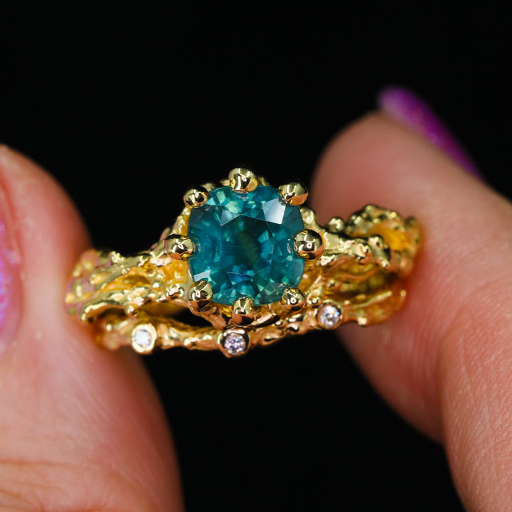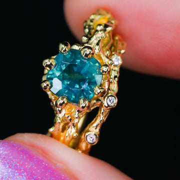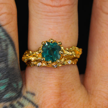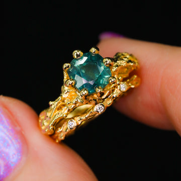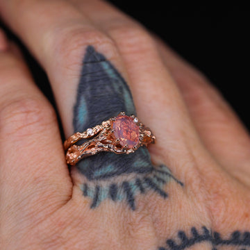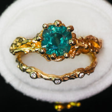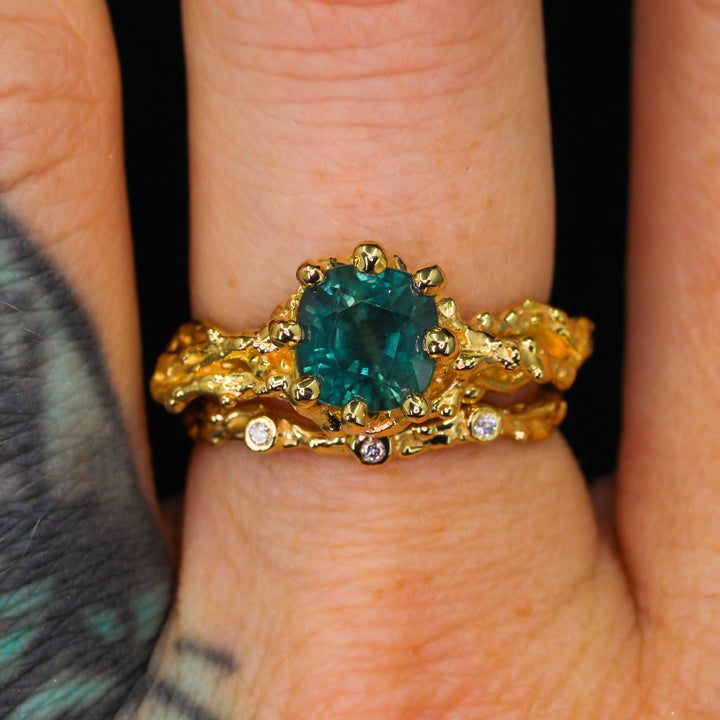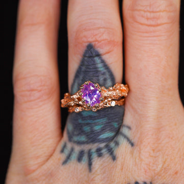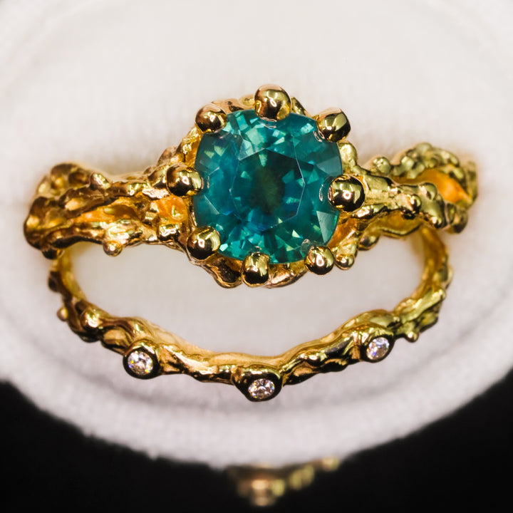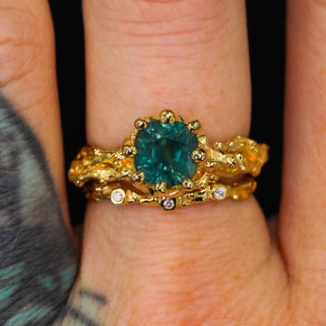We will hand carve your ring with your chosen loose gemstone, and therefore, no two rings will ever be exactly the same. We will create with the same design in mind and intention, however placement and little variations in textures/widths will occur.
