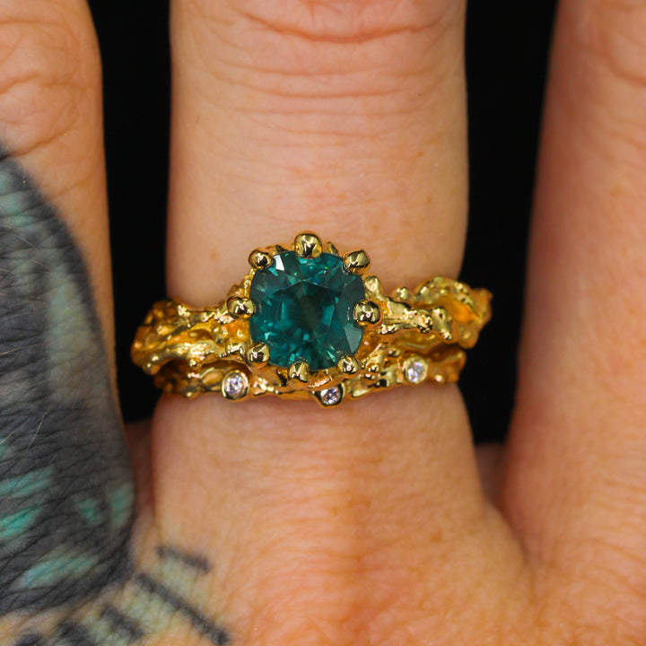 This listing is for a bespoke one of a kind pictured 14K gold ring with your chosen center loose gemstone (and optional matching band with white diamond accents). This is a thick, well-made ring that is made to stand the test of time, but still looks beautifully feminine and organic. This handmade ring design is meant for daily wear and could be worn as an engagement ring or a right-hand ring.
